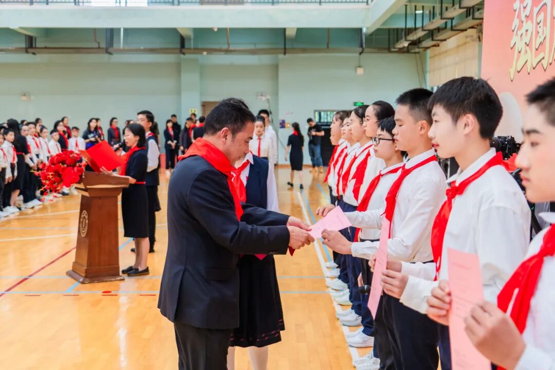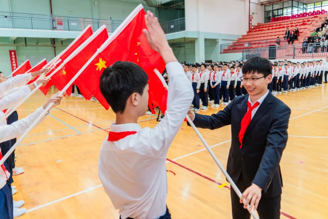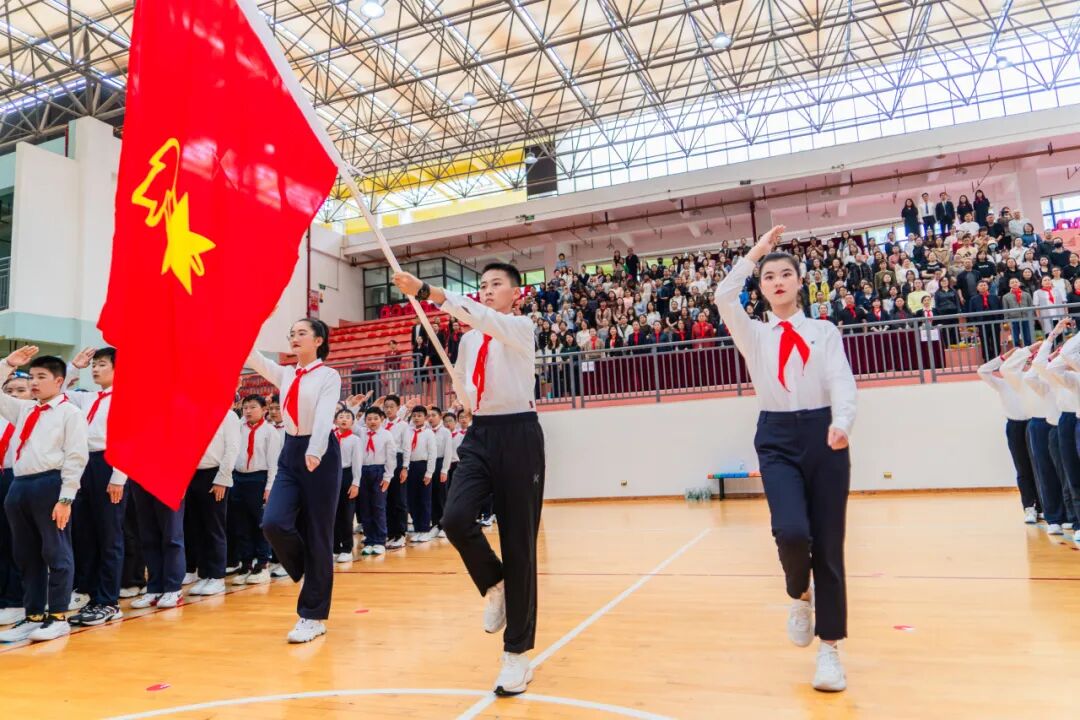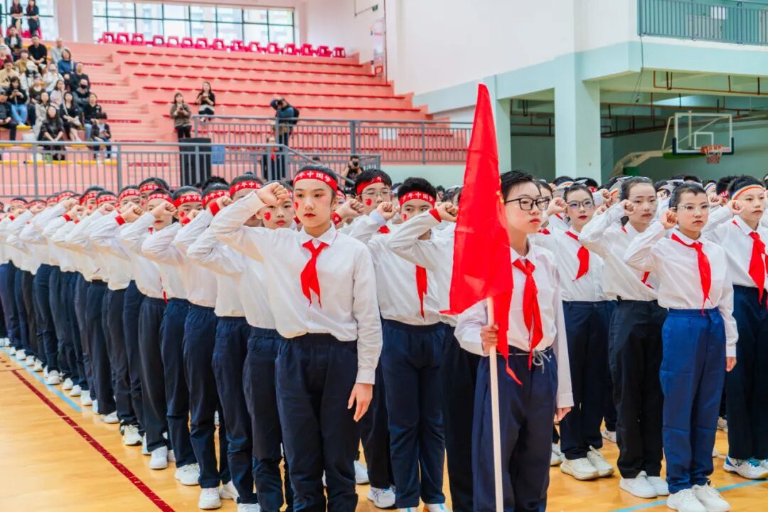 下午3:30,建队仪式在庄严的出旗曲中拉开序幕。旗手们踏着铿锵的步伐护卫队旗入场,每一步都踏出新时代少年的坚定信仰。
