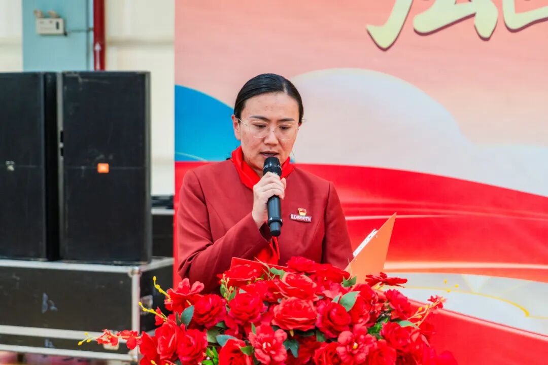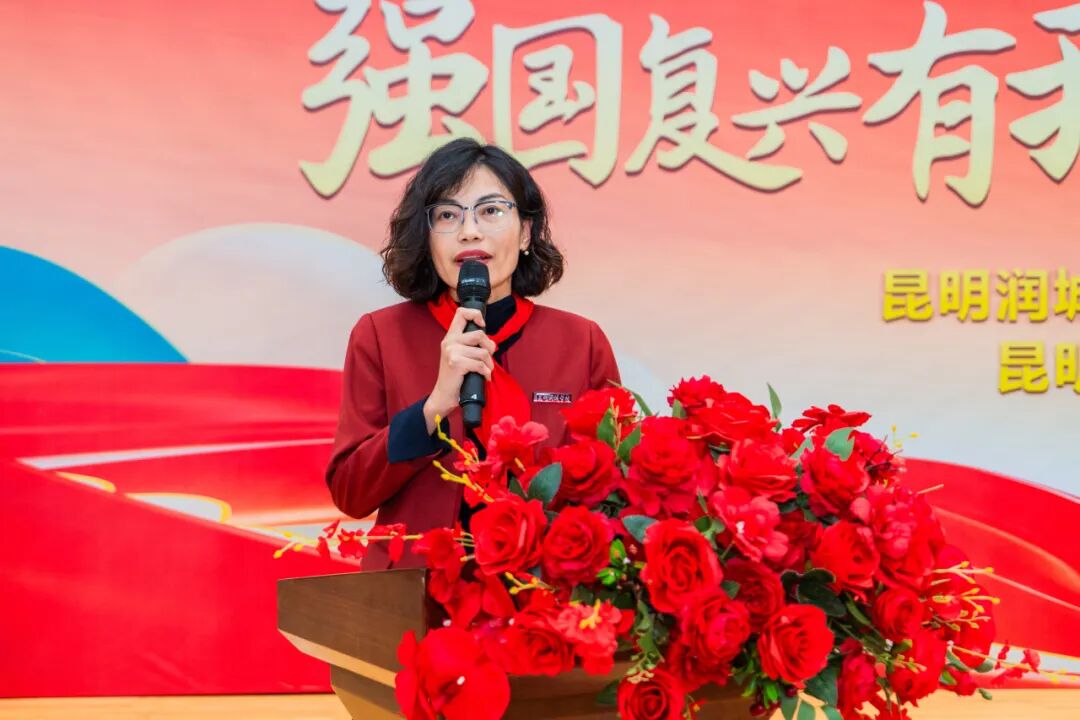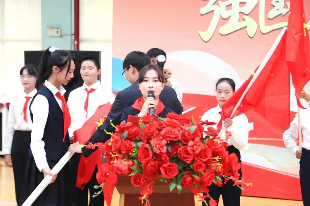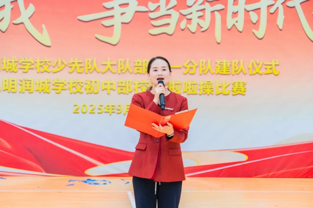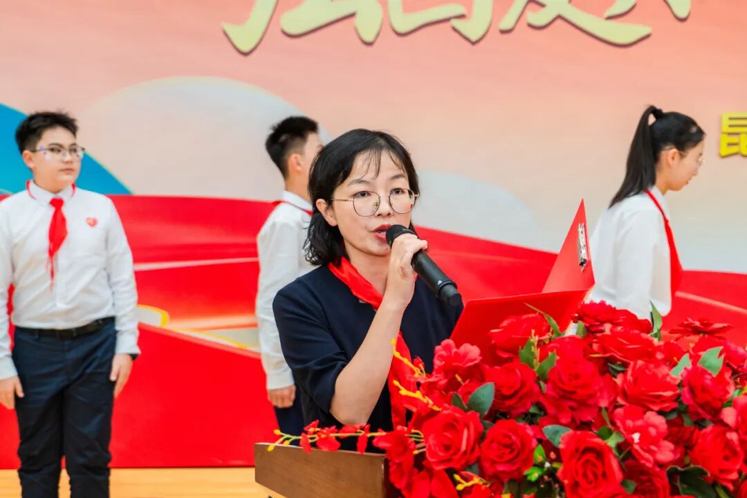 昆明润城学校党委委员、初中部执行校长李壮老师发表致辞。她的讲话如战鼓催征,激励着每一位少先队员:“76年风雨兼程,76年薪火相传。当前世界正经历百年未有之大变局,我们要铭记‘胜人者有力,自胜者强’的箴言。如同东风导弹守护国家安全,我们要用知识和信念筑起民族的钢铁长城!”