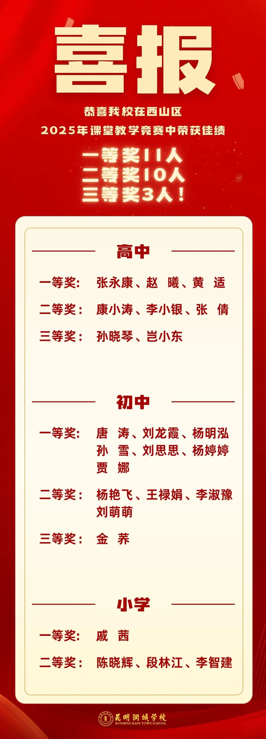 西山区2025年课堂教学比赛日前圆满落幕。昆明润城学校24名参赛教师凭借过硬的专业素养、灵动的课堂设计与前沿的教学理念,在激烈角逐中脱颖而出,一举斩获多项荣誉,充分彰显了学校卓越的教育教学实力。