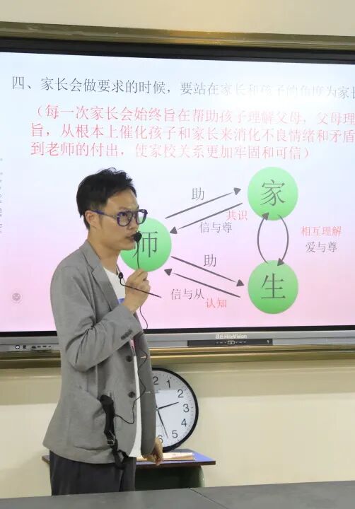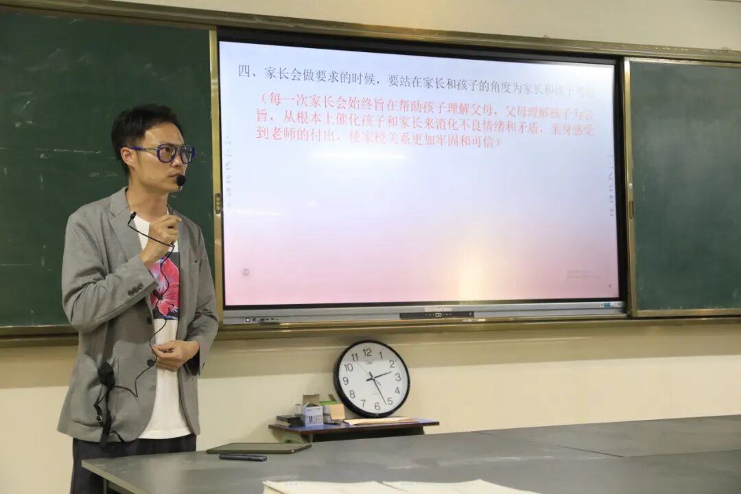 初三班主任、生物老师徐珑峰则聚焦 “家校协作与习惯培养”,分享自己在班级管理中的实践思路。他以所带班级为例,详细介绍班主任如何站在家长视角为学生与家长考量,还特别阐述了 “培养式管理与改造式管理的差异”。