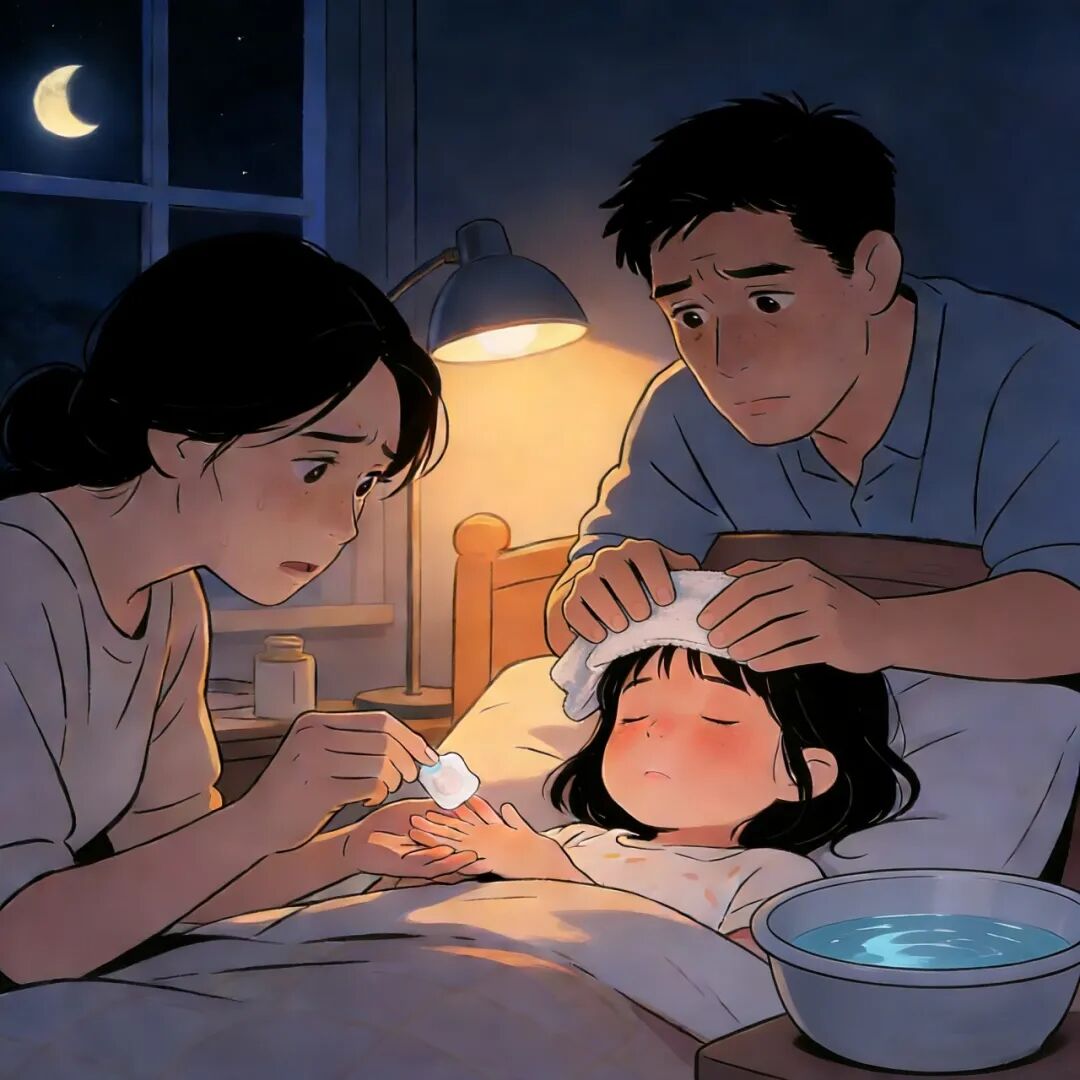 接下来的时间,仿佛被按下了快进键,却又在每一分每一秒里被无限拉长。我和你爸爸用酒精棉球,一遍遍地擦拭你的额头、脖颈、手心脚心。又用毛巾浸湿反复擦拭,水盆里的水换了一次又一次,毛巾上的暖意总是很快就被你身体的炙热夺走。物理退烧贴像一片无力的雪花,覆在你滚烫的额头上,很快也变得温吞。