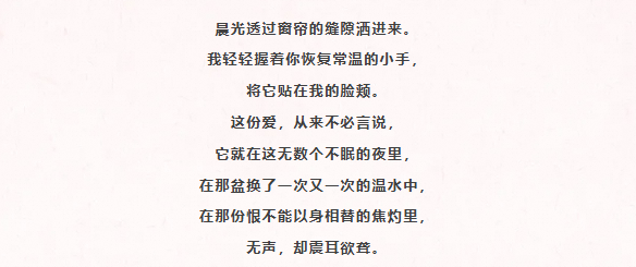 晨光透过窗帘的缝隙洒进来。我轻轻握着你恢复常温的小手,将它贴在我的脸颊。这份爱,从来不必言说,它就在这无数个不眠的夜里,在那盆换了一次又一次的温水中,在那份恨不能以身相替的焦灼里,无声,却震耳欲聋。