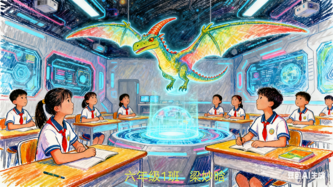 我通过校门口的量子扫描仪进入校园的4D全息空间教室,门一开,时间仿佛倒流六千五百万年——这里已是侏罗纪世界!高耸的蕨类植物随风摇曳,远处传来梁龙低沉的吼叫。我和同学们看着全息投影的翼龙在空中盘旋飞翔,每一只恐龙都呈现透明骨骼结构,点击还能放大观察,旁边附带详细说明。
