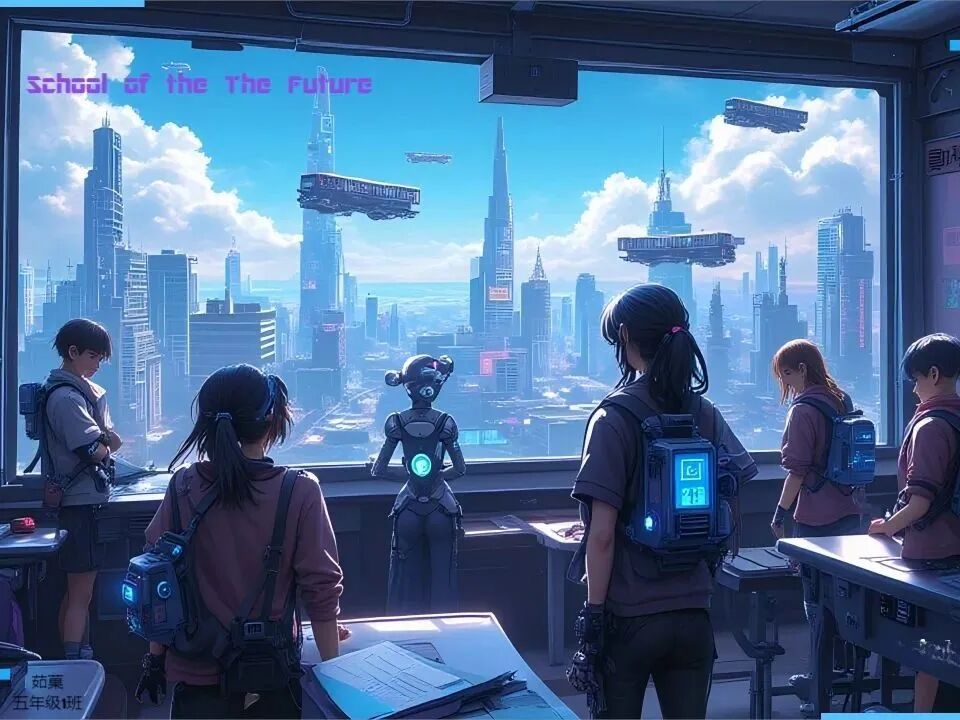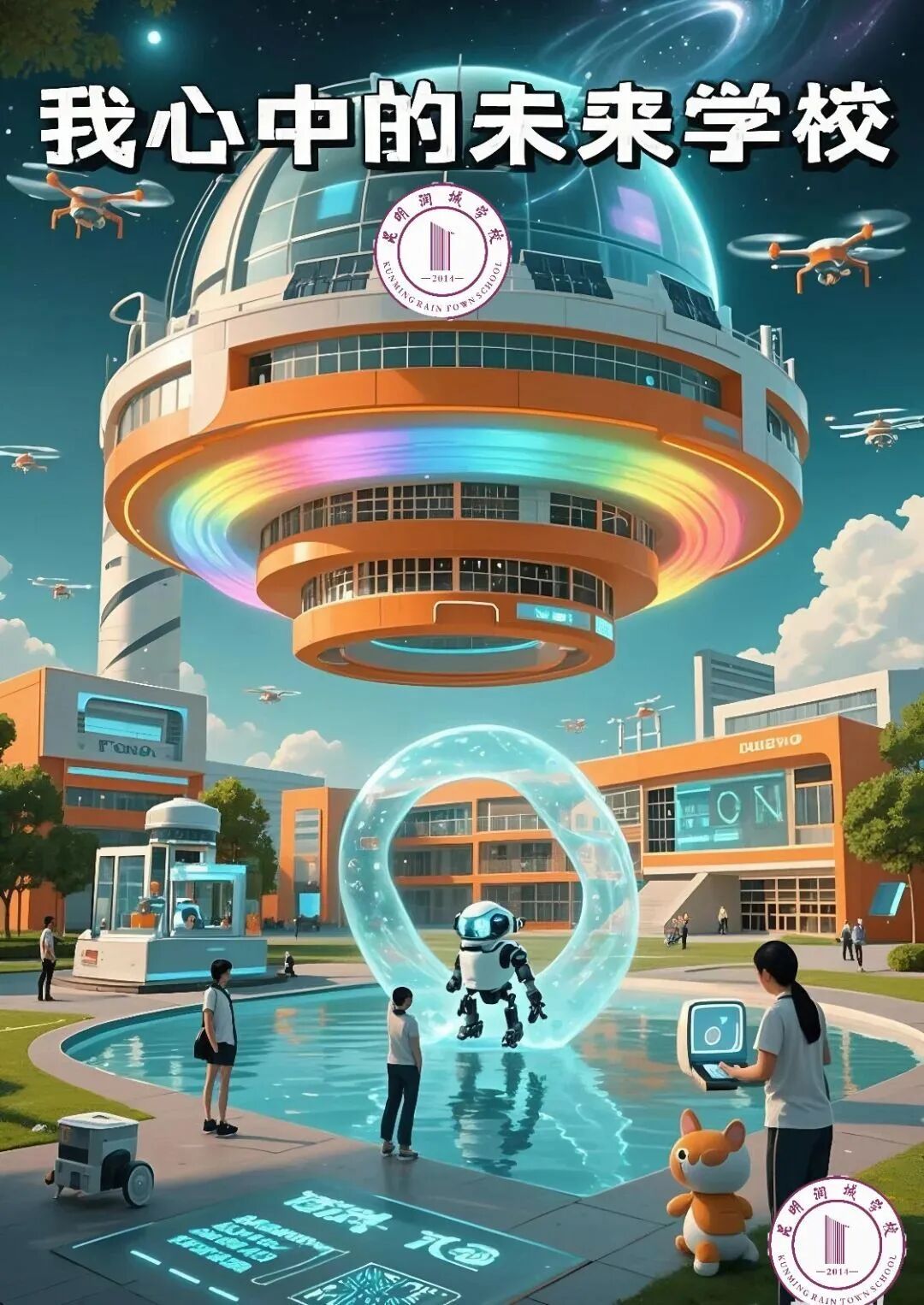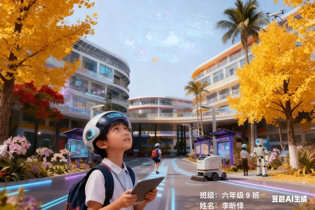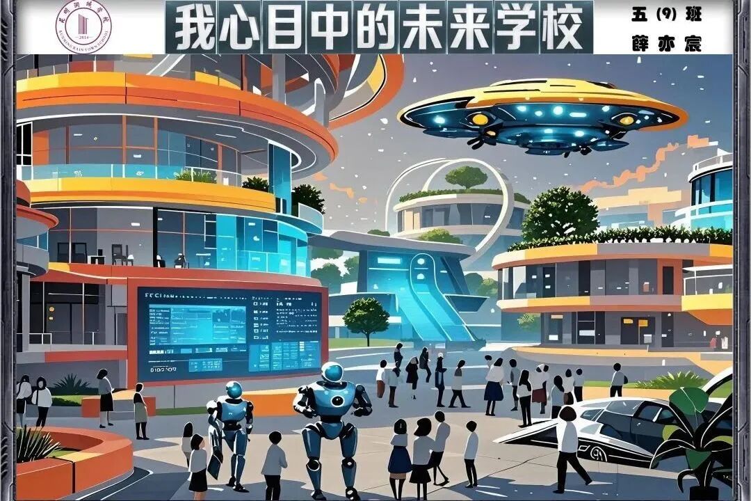 在未来学校中,语文课堂上,AI虚拟导师会根据我们的阅读偏好推荐经典名著,还能和我们一起分析文章的修辞手法。数学课上,全息投影会把复杂的几何图形立体呈现,让解题变得直观又有趣”,展现未来校园里AI对学科学习的助力。历史课上,同学们通过VR设备穿越。信息技术课上,“校园里的‘跨学科实验室’是我们的乐园,在这里,我们用编程让机器人演绎历史故事。科学课上,我们用化学实验模拟宇宙中的元素变化,每一次实践都是知识的跨界碰撞。