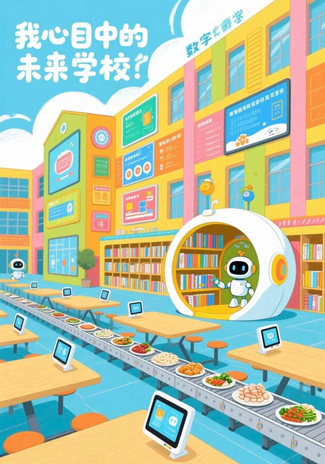 教学楼像穿了新衣服:栏杆被刷成彩虹色,阳光一照闪得晃眼;玻璃窗干净得像没存在过,把蓝天揉成了彩色光斑;墙壁白得像刚下的雪,连一点旧痕迹都找不到。墙面上挂着个AI虚拟屏,按一下“校园导航”,小箭头就“啾”地飞到我脚边;按“趣味学习”,屏幕里跳出个穿汉服的小人,脆生生念着“相见时难别亦难”,连诗句里的花瓣都飘到我手心里啦!