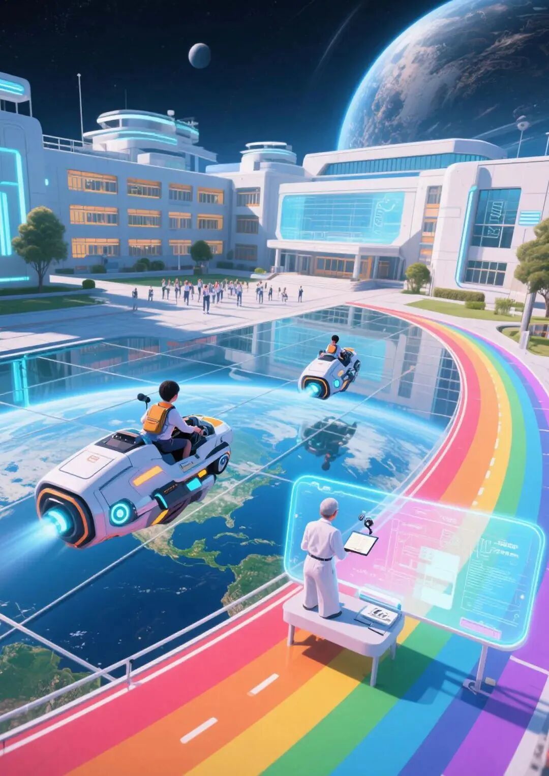 于是,我迫不及待地跑进教学楼。天呐!走廊墙壁是可变色的电子屏,正实时显示着全球气候数据。经过一间教室时,我忍不住驻足。讲台上,人形机器人教师正在讲授几何学,它挥手间便在空气中投射出立体的几何图形。学生们戴着神经感应头环,通过意念操控着课桌上浮现的全息情绪界面。他们脊背上的坐姿矫正器泛着微光,后来我才知道,那是智能校服在自动调整他们的姿势。